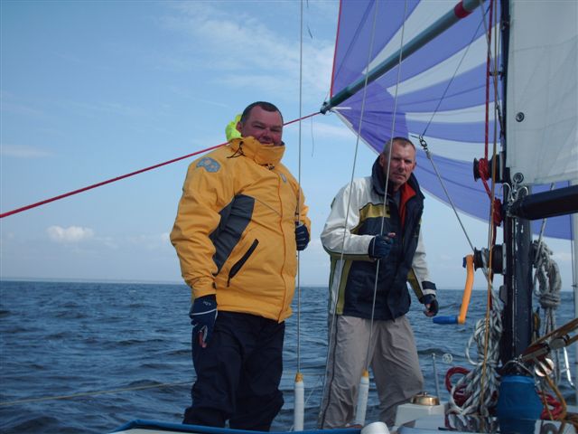 Liepos 6-a diena 15:37. Kairėje Rolandas, dešinėje - Algis. Algis - bocmanas. Jis laive palaiko tvarką ir gerai dirba ant bako - keičia bures, netingi spinakerį kilnoti. Žodžiu, žmogus norintis plaukti greitai ir nugalėti. P.S. Fone jau matosi Klaipėda.